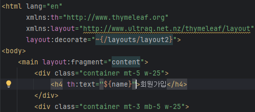 html 문서에서 타임리프와 레이아웃을 사용하기 위해 다음 내용을 포함시킨다.